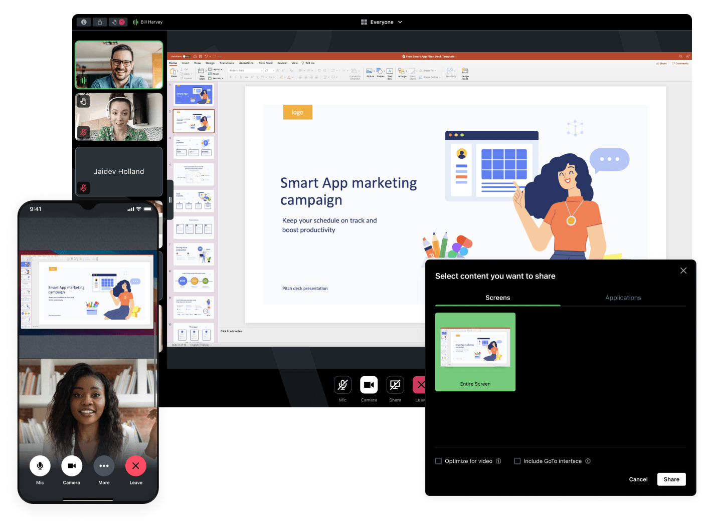 Inicie e participe de debates em segundos e ofereça aos participantes uma visão integral da sua apresentação. Compartilhe a tela do seu dispositivo Android e prepare-se para reuniões de onde estiver.